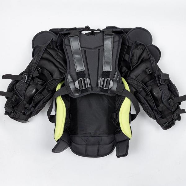 Warrior는 X4 E+ 가슴 및 팔 보호대의 외부에 나일론과 메쉬 소재를 사용하여 내구성을 높이면서도 편안함을 유지합니다. 또한 통기성이 뛰어나 빙판 위에서 세이브를 할 때 과열을 방지합니다.