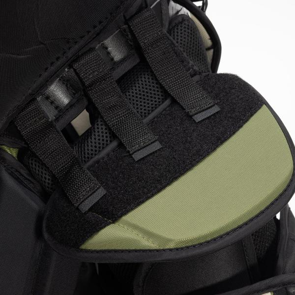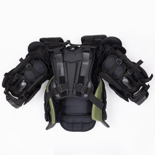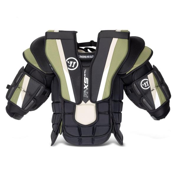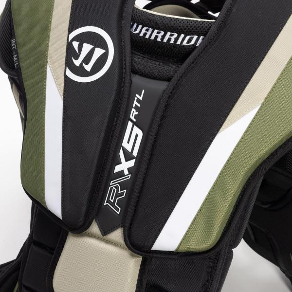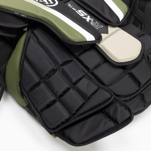 워리어는 X5 RTL 가슴 및 팔 보호대의 외부에 나일론과 메쉬 소재를 계속 사용하여 내구성을 높이면서도 편안한 착용감을 제공합니다. 또한 통기성이 뛰어나 빙판 위에서 세이브를 하는 동안 과열되는 것을 방지합니다.내부 폼