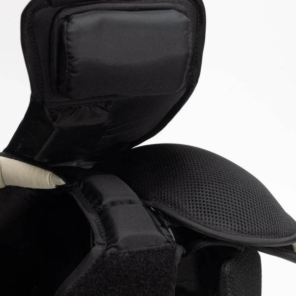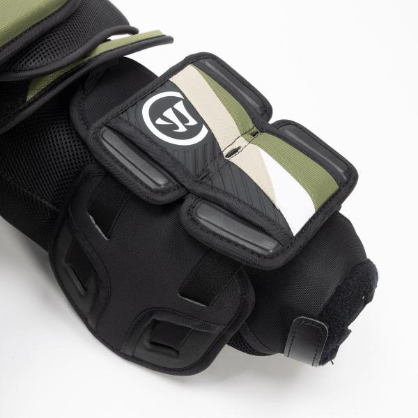 팔, 팔꿈치, 전완은 뼈 구조 시스템으로 보호됩니다. 이는 빠른 속도의 공격(RVH)이나 각도가 좋지 않은 샷을 당할 때 완벽한 보호 기능을 제공합니다. 워리어는 삼두근 사이와 팔 전체에 네오프렌 연결 장치를 추가하여 팔 보호대 안에 안전하게 고정되도록 했습니다.스트랩핑 시스템