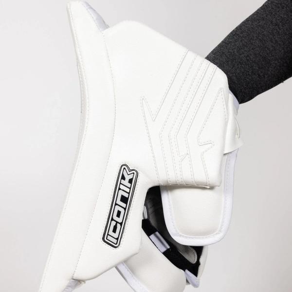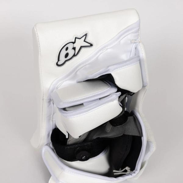 브라이언스 아이코닉 성인 골리 블락커 INT 팜은 화이트와 블랙/화이트 두 가지 색상으로 출시됩니다. 두 블락커 모두 공을 잡는 손에 따라 풀 라이트 옵션을 선택할 수 있습니다.