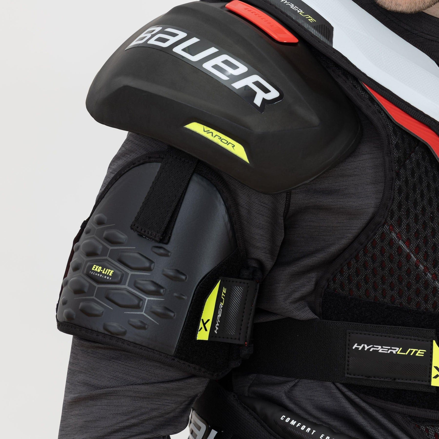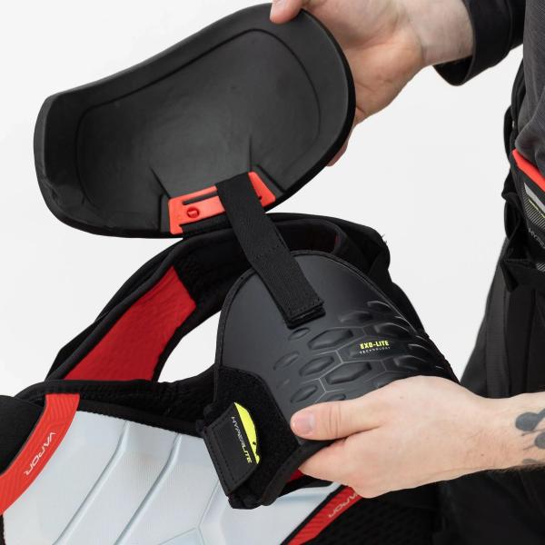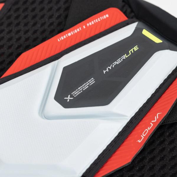 바우어는 Vapor Hyperlite 숄더 패드를 통해 Hyperlite 라인을 더욱 확장했습니다. 이 제품은 2X 시리즈를 뛰어넘는 디자인을 자랑하며, Aerolite 숄더 캡과 Hyperlite HD 폼 등 가장 신뢰할 수 있는 기술들을 다시 적용했습니다. 또한 Thermocore Zero 라이너, 일체형 EXO-Lite 슬리브, Hyperlite HD 흉골 보호대 등 주요 부분에서도 개선이 이루어졌습니다. 이 패드는 Flexaprene 조끼와 강화된 척추 및 갈비뼈 보호 기능도 갖추고 있습니다.