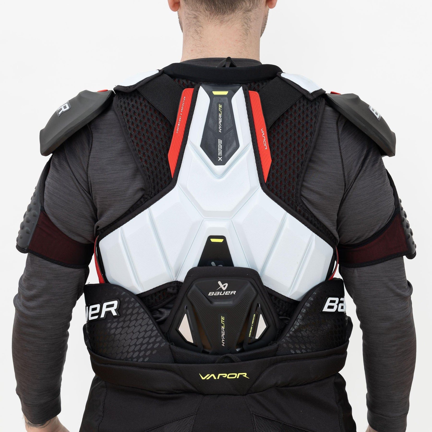 척추 부분에는 이전 세대와 동일한 Hyperlite HD 폼이 계속 사용됩니다. Hyperlite HD 폼은 편안하고 가벼워 공기역학적인 Vapor 라인의 디자인을 뒷받침합니다. 흉골과 마찬가지로, Vapor 척추 부분의 또 다른 특징은 Shocklite 폼 인서트입니다. 이 소재는 Bauer 제품 전반에 걸쳐 프로 수준의 충격 흡수 성능으로 잘 알려져 있습니다. 척추 부분에는 추가적인 충격 흡수를 위해 EXOLite 스킨도 적용되었습니다.