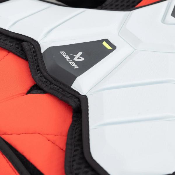 어깨 보호대는 Aerolite 2.0 소재로 제작되었으며, Connektor를 사용하여 패드에 고정됩니다. Aerolite는 Bauer 장비 및 기타 스포츠 용품의 보호 장비에 사용되는 소재로, 가벼운 무게와 강한 충격을 흡수 및 분산시키는 뛰어난 능력으로 잘 알려져 있습니다.