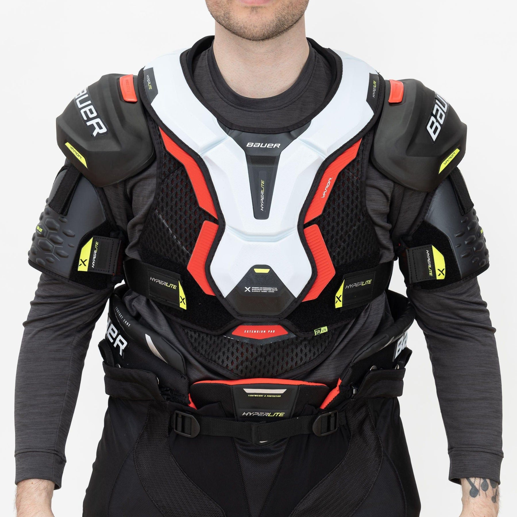 바우어는 Vapor Hyperlite 숄더 패드를 통해 Hyperlite 라인을 더욱 확장했습니다. 이 제품은 2X 시리즈를 뛰어넘는 디자인을 자랑하며, Aerolite 숄더 캡과 Hyperlite HD 폼 등 가장 신뢰할 수 있는 기술들을 다시 적용했습니다. 또한 Thermocore Zero 라이너, 일체형 EXO-Lite 슬리브, Hyperlite HD 흉골 보호대 등 주요 부분에서도 개선이 이루어졌습니다. 이 패드는 Flexaprene 조끼와 강화된 척추 및 갈비뼈 보호 기능도 갖추고 있습니다.