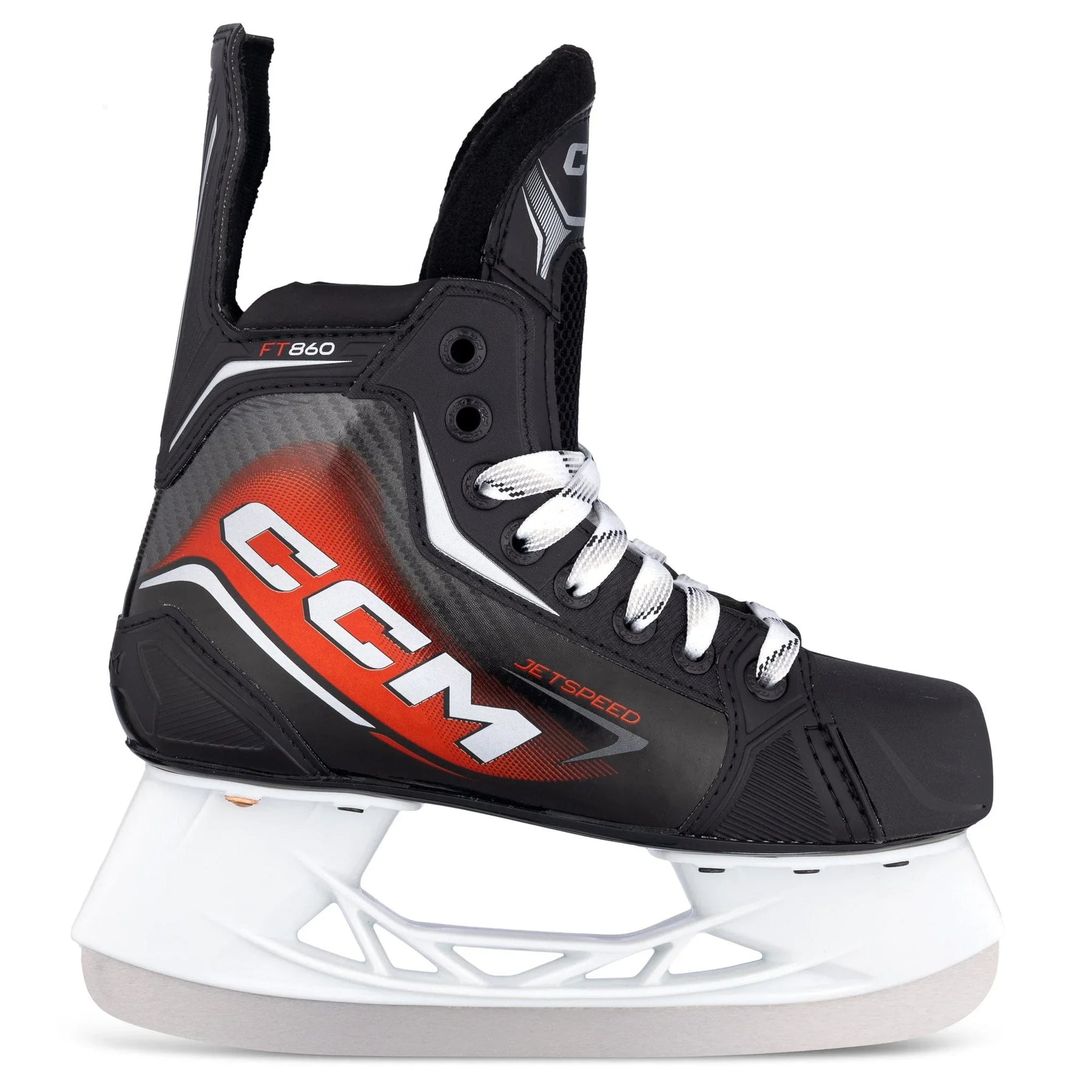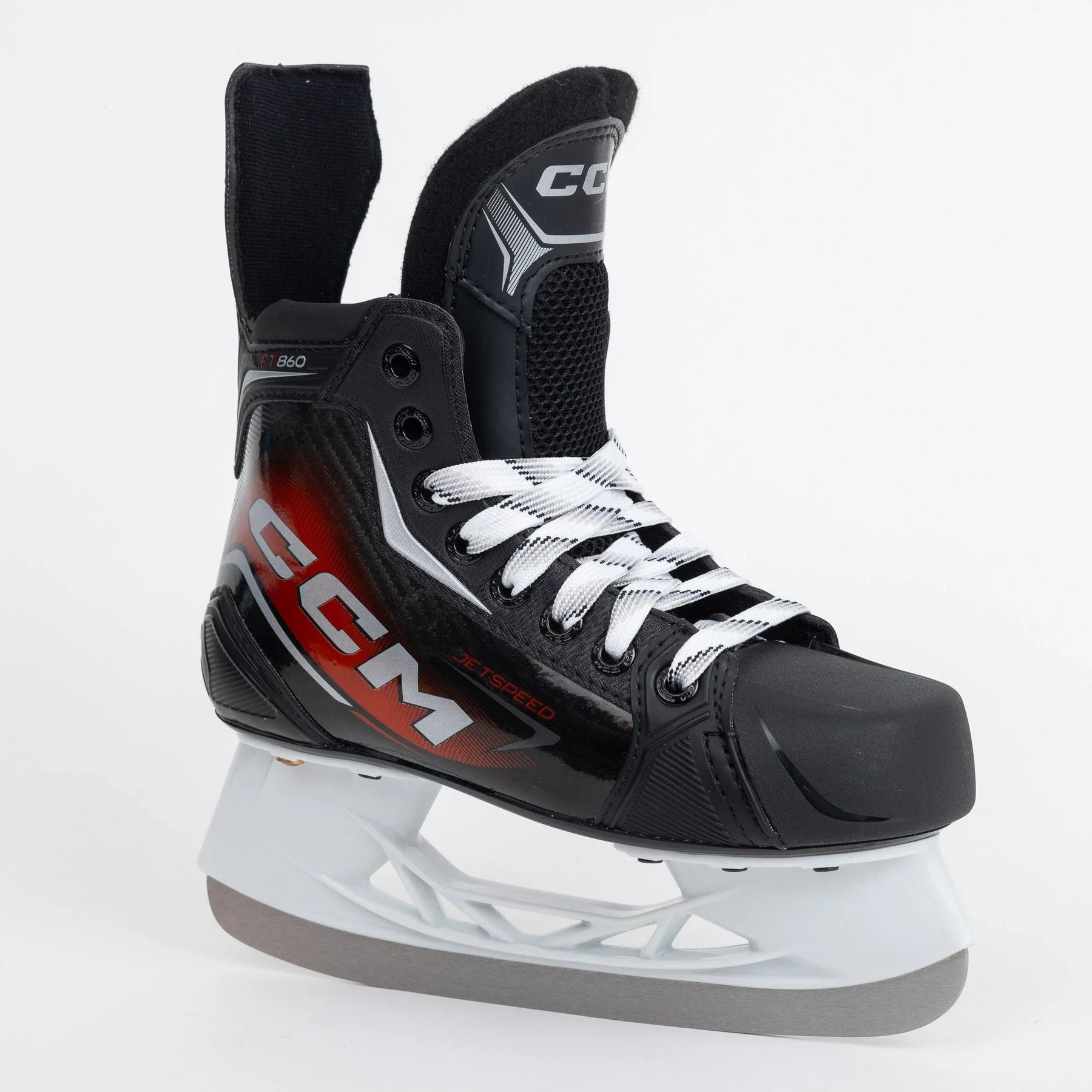 CCM은 레크리에이션 수준의 플레이어를 위해 FT860을 출시했습니다. 이 제트스피드(Jetspeed)의 주요 특징으로는 2D 쿼터 구조, 7mm 펠트 텅, CCM 오솔라이트(Ortholite) 깔창, 그리고 미리 날카롭게 연마된 스테인리스 러너가 장착된 스피드블레이드(Speedblade) 블레이드가 있습니다.스케이트 핏 프로필