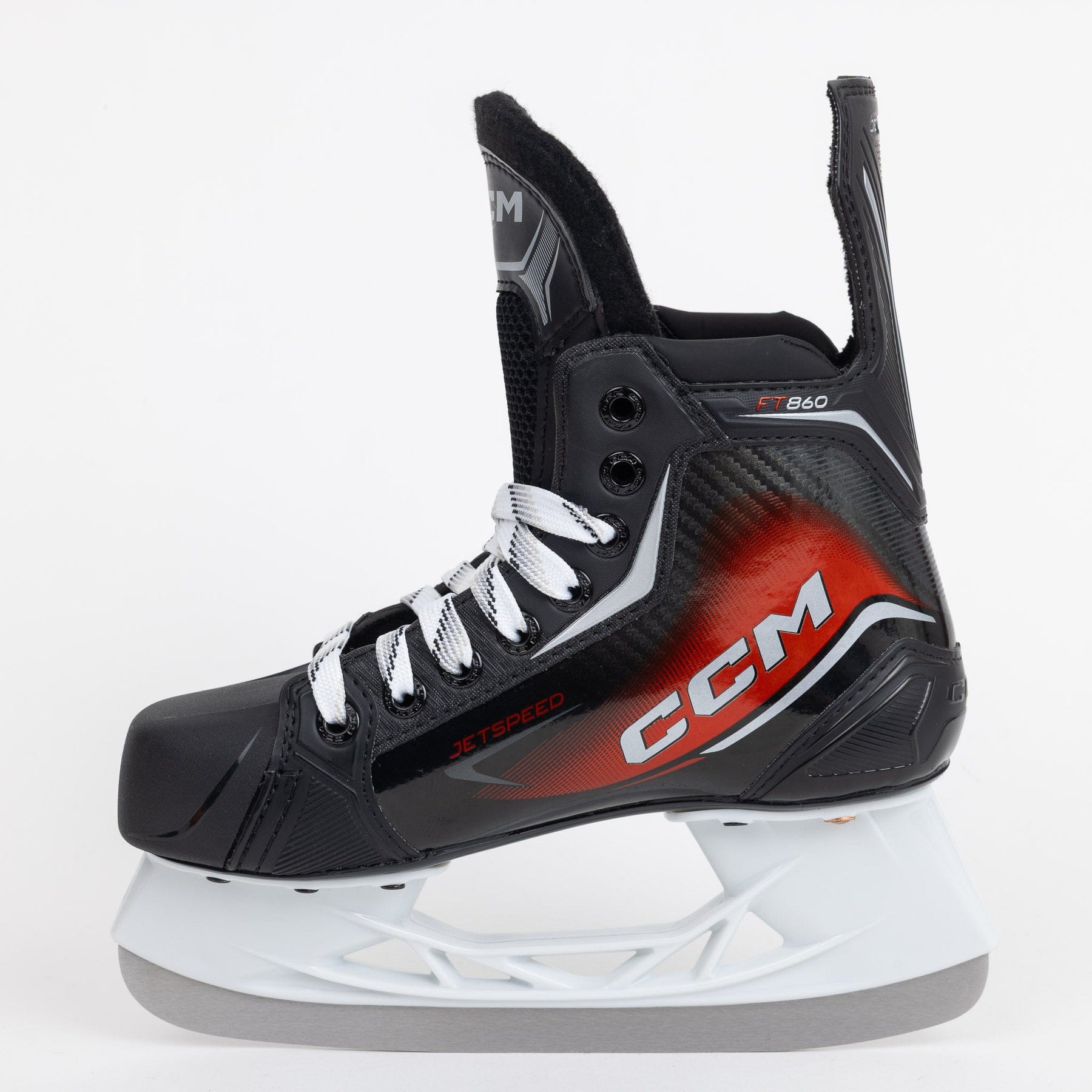 FT860 스케이트는 새로운 Jetspeed 라인 출시 당시 선보였던 엘리트급 그래픽과 매우 흡사하며, 스케이트 전체에 빨간색과 검은색이 사용되었습니다. 인조 카본 스킨과 빨간색이 어우러진 유연한 디자인이 스케이트에 적용되었으며, 스케이트 측면에는 흰색 CCM 로고가 새겨져 있습니다.