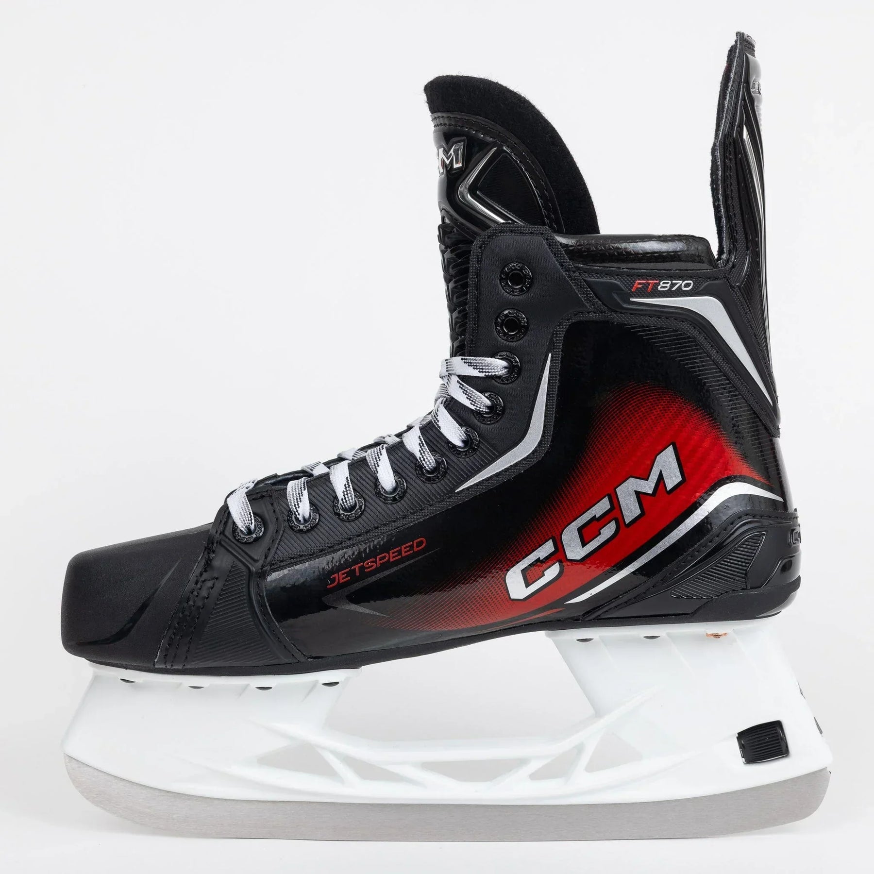CCM은 레크리에이션 수준의 플레이어를 위해 FT870을 출시했습니다. 이 제트스피드(Jetspeed)의 주요 특징으로는 2D 메타프레임 구조, HD 마이크로파이버 라이너, 7mm 펠트 텅, CCM 오솔라이트 인솔, 그리고 XS1 스틸이 적용된 스피드블레이드 XS가 있습니다.스케이트 핏 프로필