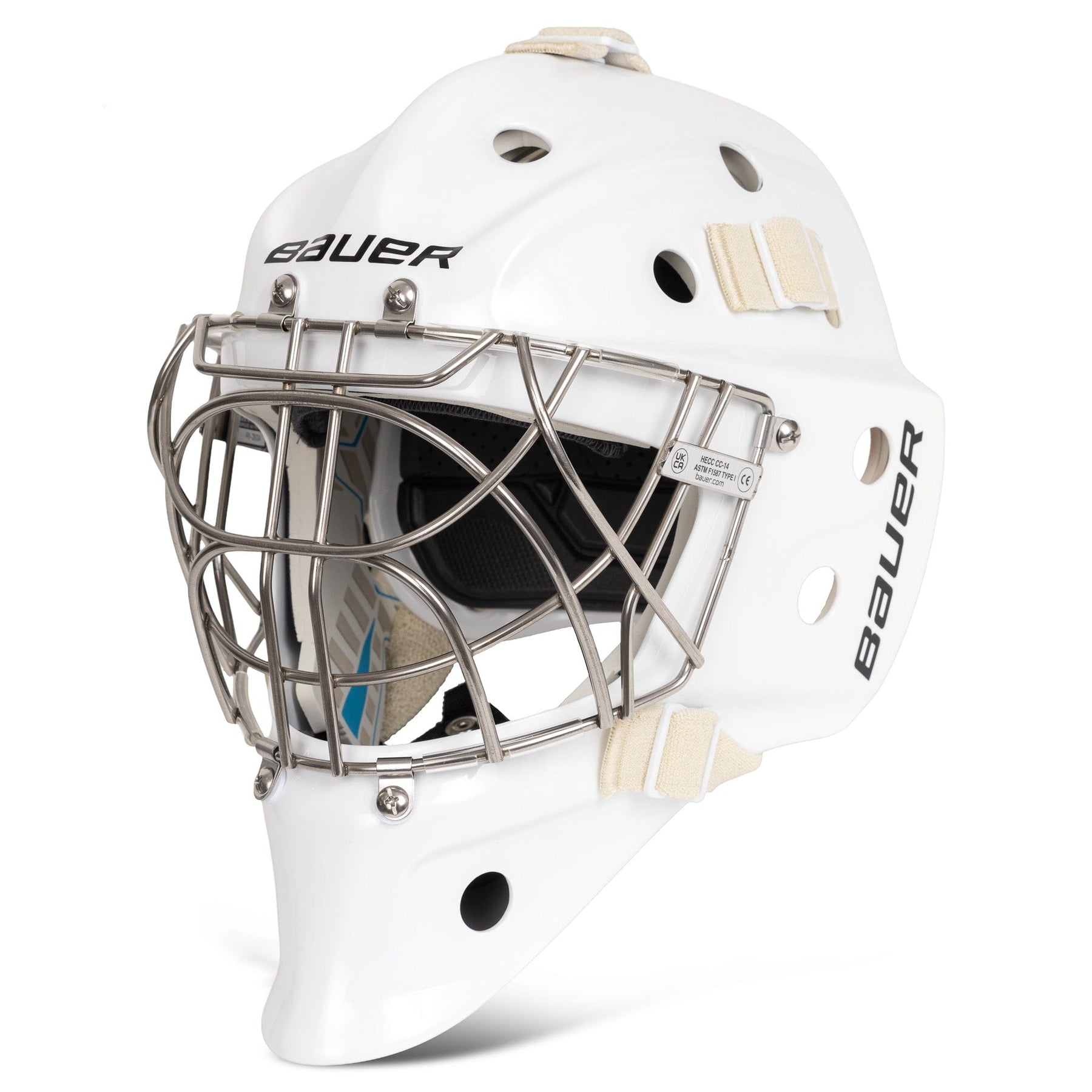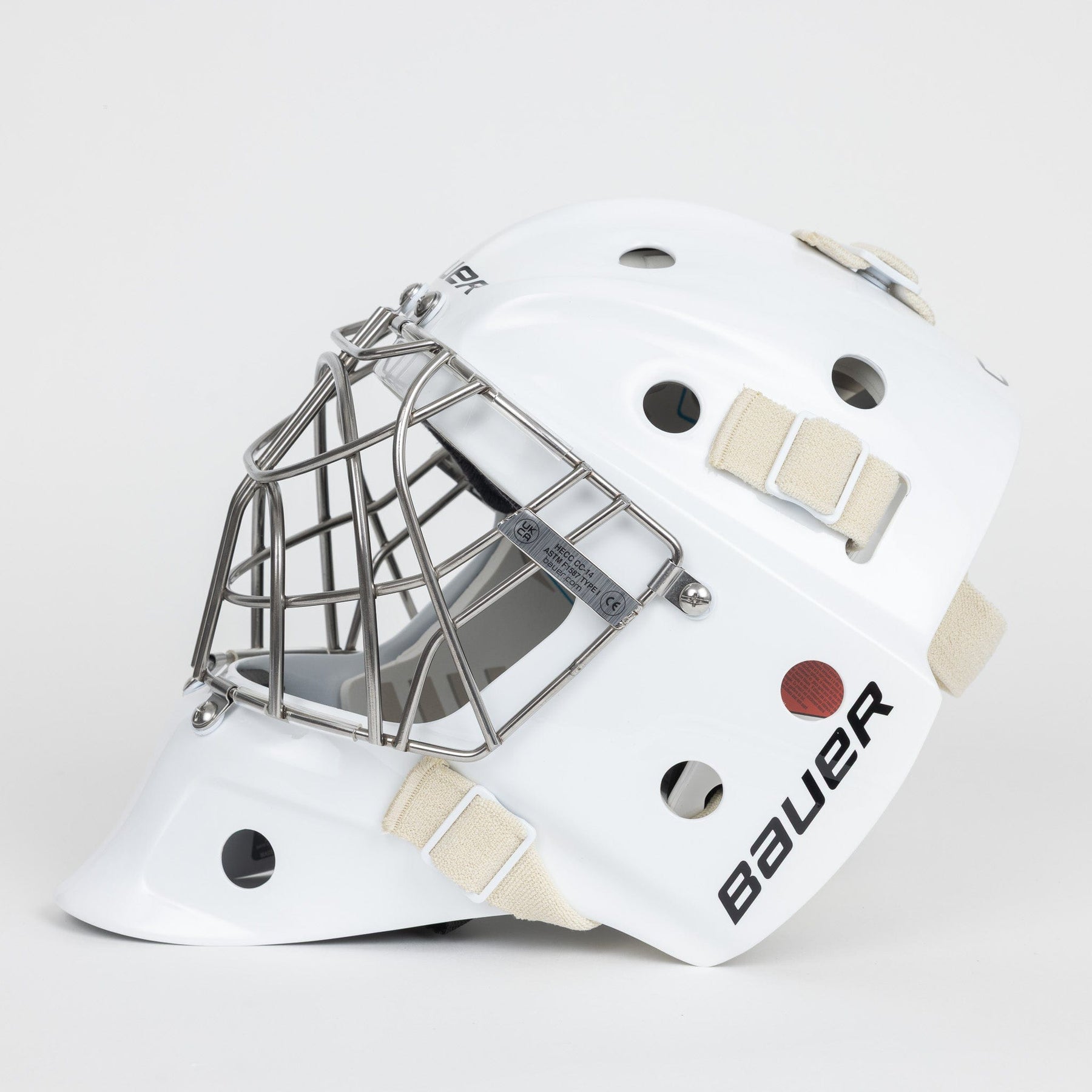 Bauer Pro-Certified 성인용 골리 마스크는 흰색과 소형, 중형, 대형으로 출시됩니다.