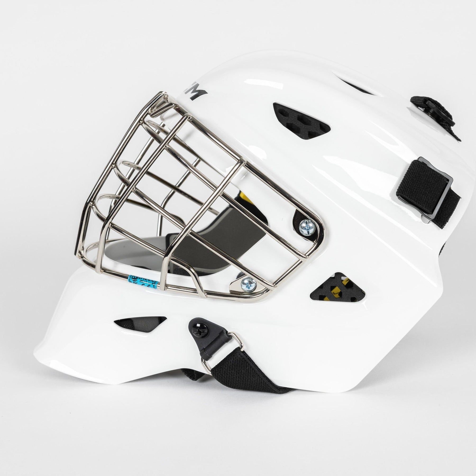 조절 가능한 폼 턱받이는 헬맷을 머리에 착용하는 동안 골텐더를 편안하고 안전하게 보호합니다. 편안함을 위해 디자인되었으며, 마스크 안쪽, 케이스 아래에 위치하며 스트랩으로 마스크에 고정됩니다. 또한 테리 소재의 스웨트밴드는 땀과 습기를 흡수하도록 설계되었지만 착용 시 편안함을 제공합니다.