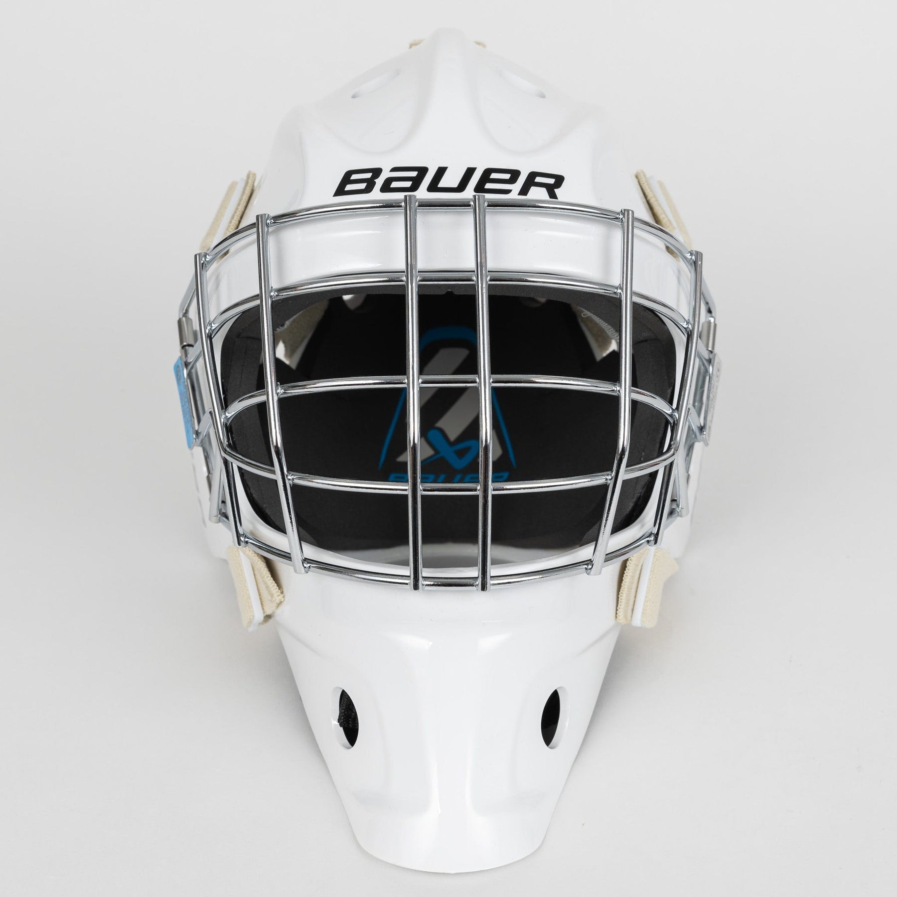 바우어 930 JR 골리 마스크는 표준화된 주니어 사이즈로 출시됩니다. 흰색 마감에 검은색 바우어 로고가 새겨져 있습니다.