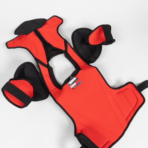 플라이프로 숄더 패드는 몰딩 처리된 갈비뼈 삽입물이 있는 분할형 플렉스프렌 조끼를 특징으로 합니다. 이 디자인은 흉골 보호대에 부착되며, 올바르게 조정하면 선수의 몸을 감싸 주요 부위를 보호하고 지지합니다.이두근 보호