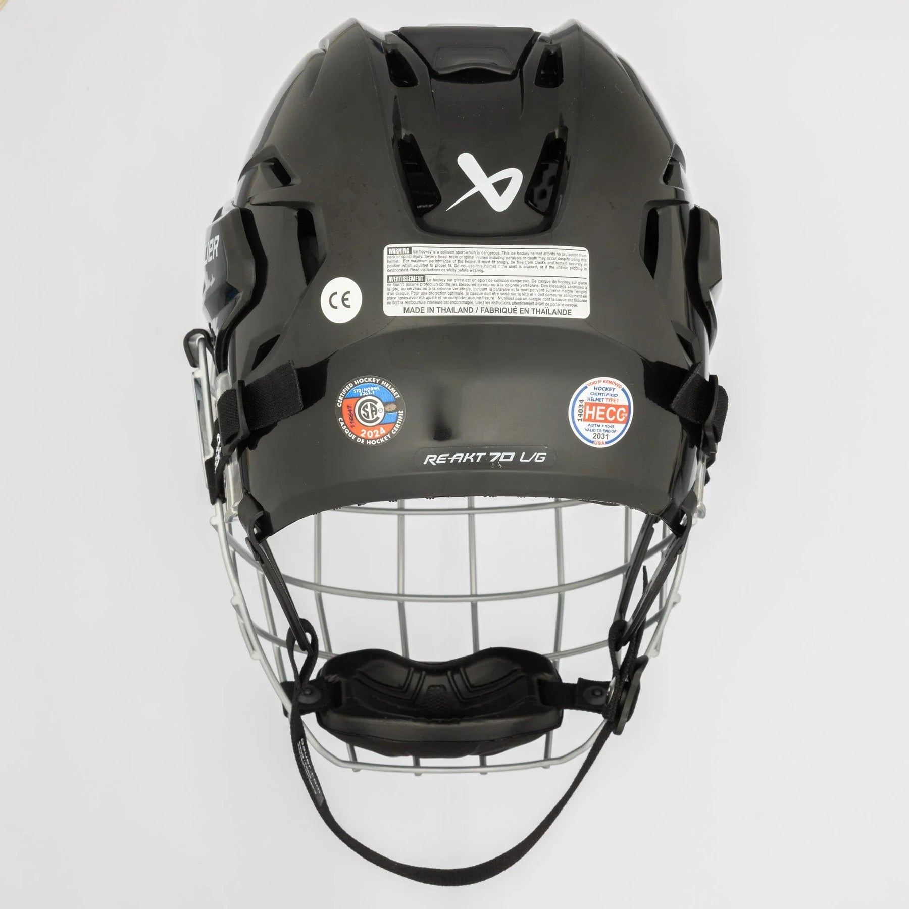 이 헬맷은 HECC(하키 장비 인증 위원회), CSA(캐나다 표준 협회) 및 CE(유럽 공동체) 인증을 획득했습니다. 이러한 스티커는 각 리그의 해당 표준을 준수함을 나타냅니다.