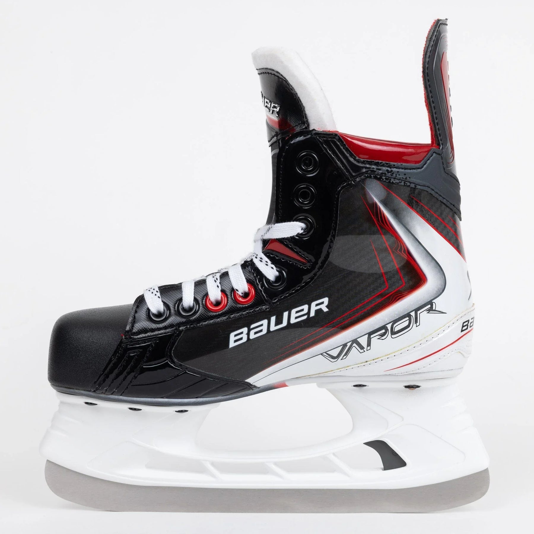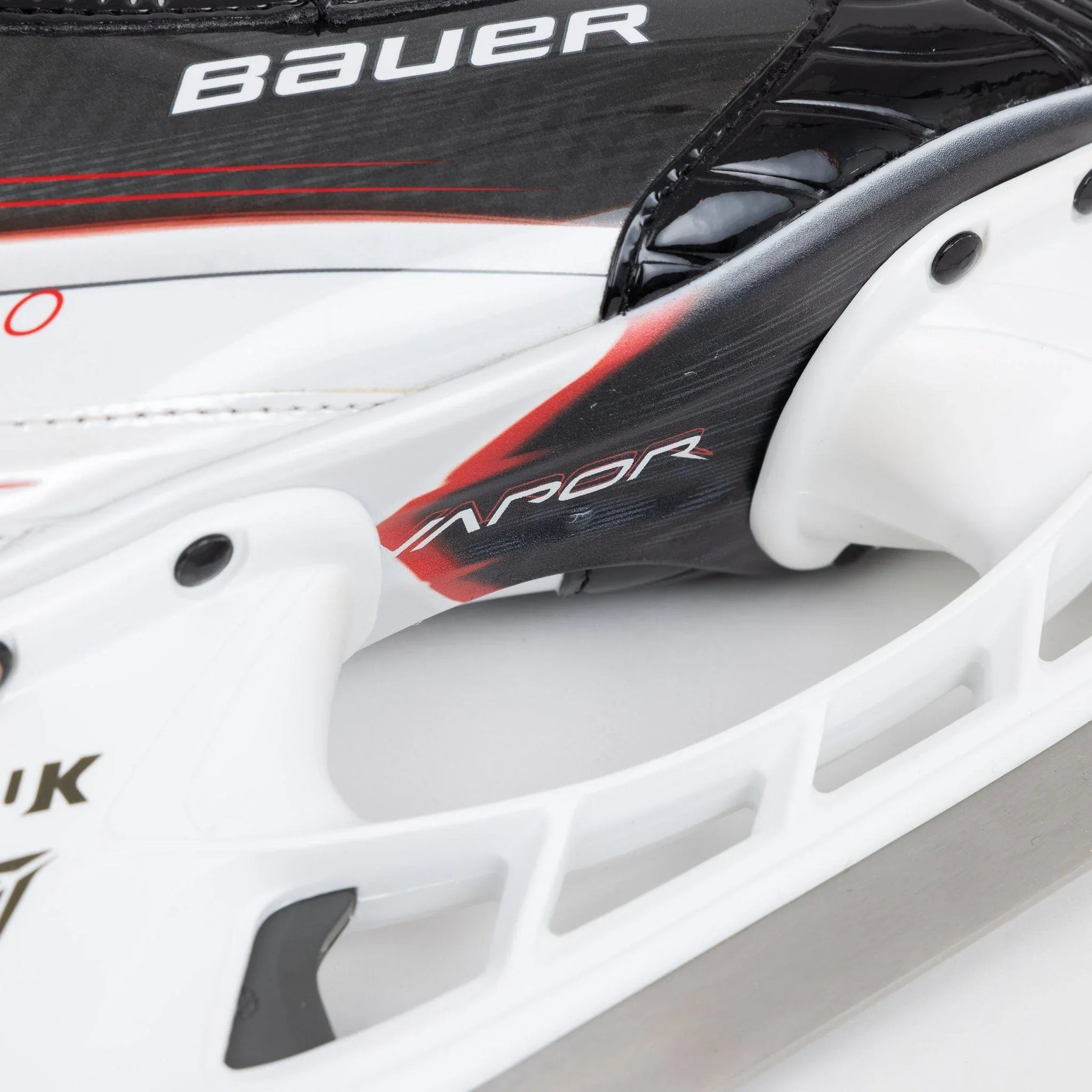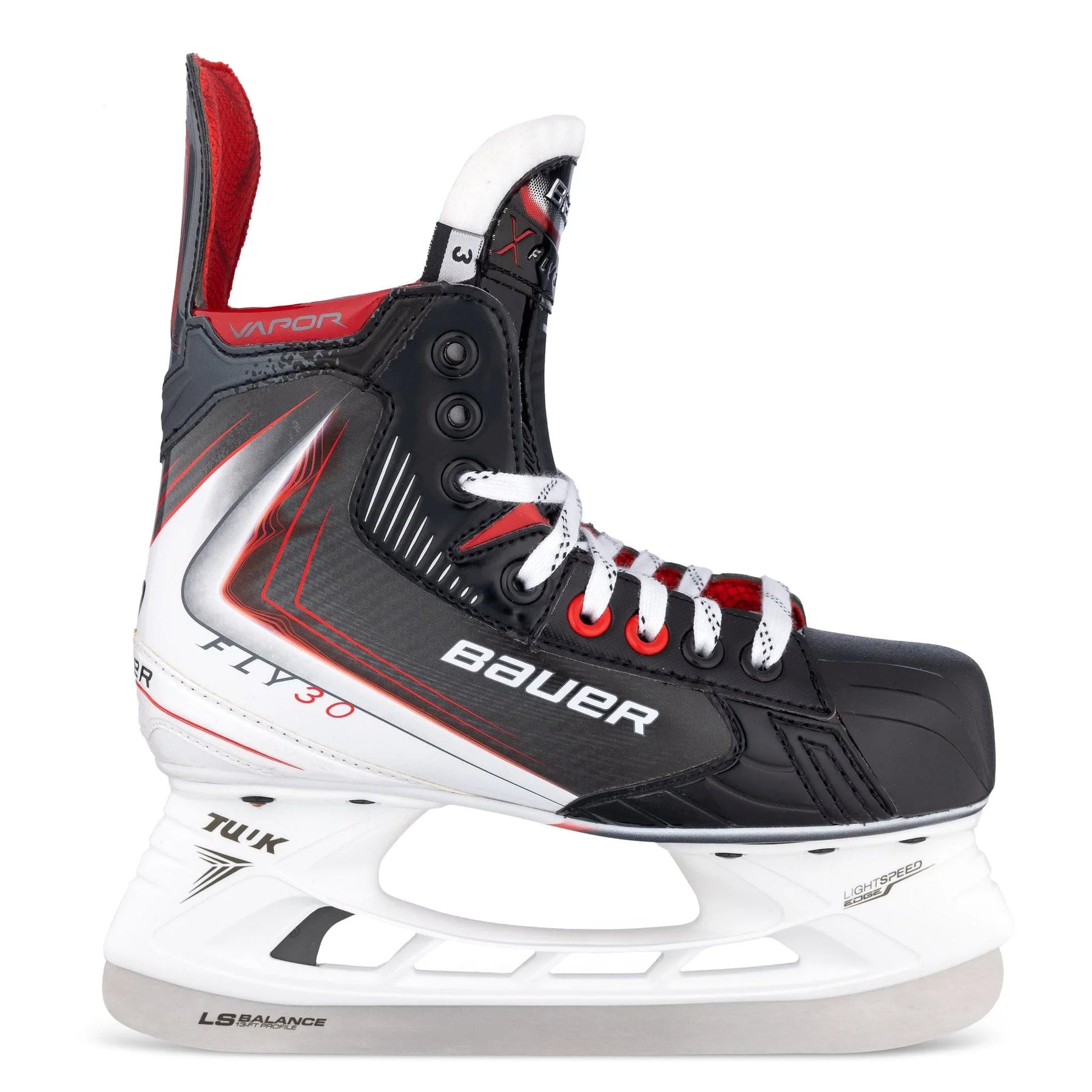 Fly30 스케이트는 검은색 바탕에 부츠 상단에서 발목을 지나 스케이트 바닥까지 흰색과 빨간색 선이 이어져 있습니다. Bauer와 Fly30 로고는 스케이트 둘레에 은색으로 선명하게 새겨져 있습니다.