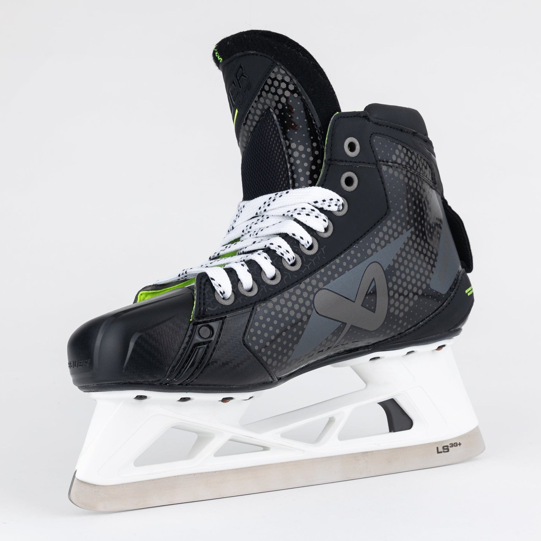 바우어 엘리트 인터미디어 골리 스케이트는 부츠 전체에 깔끔한 검정색과 짙은 회색 패턴이 혼합되어 있으며, 뒤꿈치, 혀, 측면 부분에는 녹색 악센트가 있습니다.