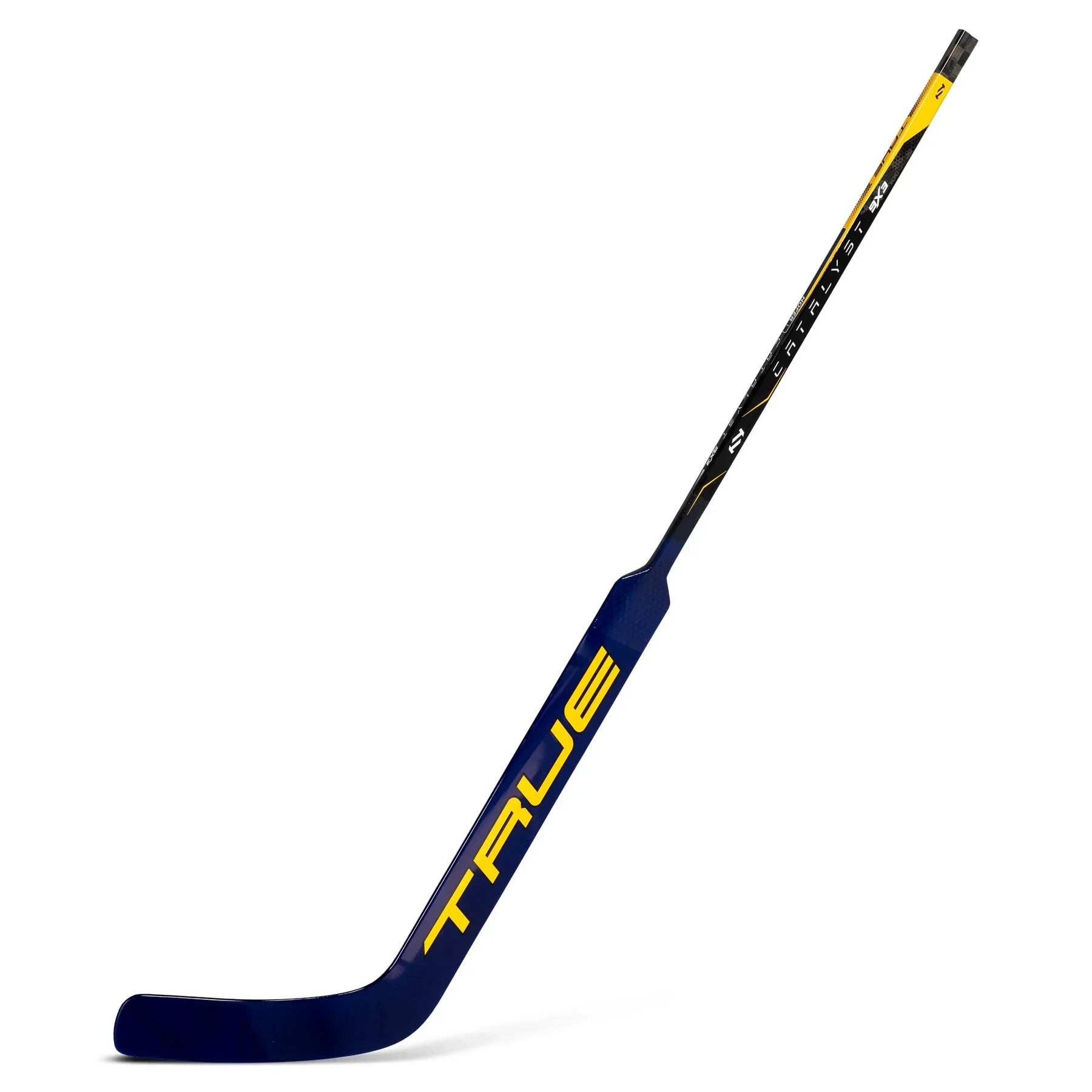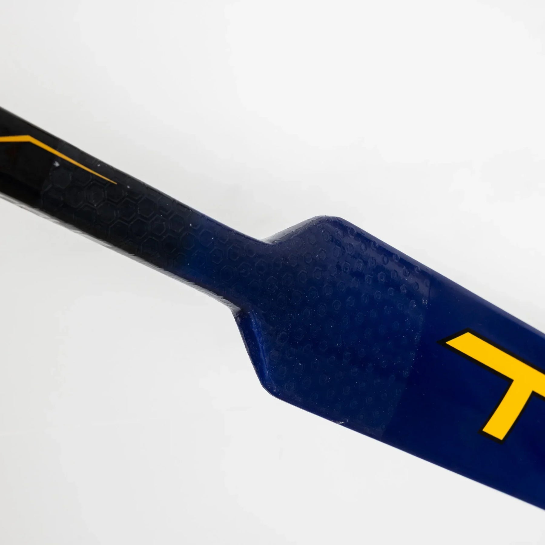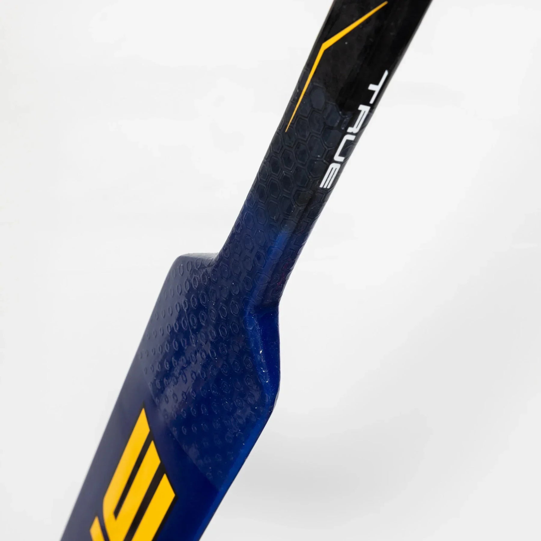 이 커스텀 True 9x3 Pro Stock 골리 스틱은 NHL 세인트루이스 블루스 소속 골리 조엘 호퍼가 사용했던 프로 샘플입니다. 블루스 팀에서 영감을 받은 파란색과 노란색 그래픽, 샤프트에 추가된 그립, 그리고 스퀘어 토우가 있는 커스텀 블레이드 패턴이 특징입니다.